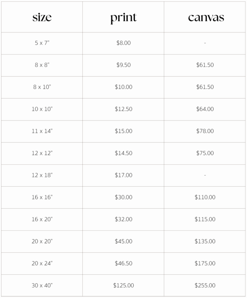 there are plenty of print options out there, but the benefit to working with me is the relationship i have with my printers and the extra editing i do to ensure your pictures print beautifully. there is a bit more work that goes into the printing process to ensure your images look flawless on your wall.
