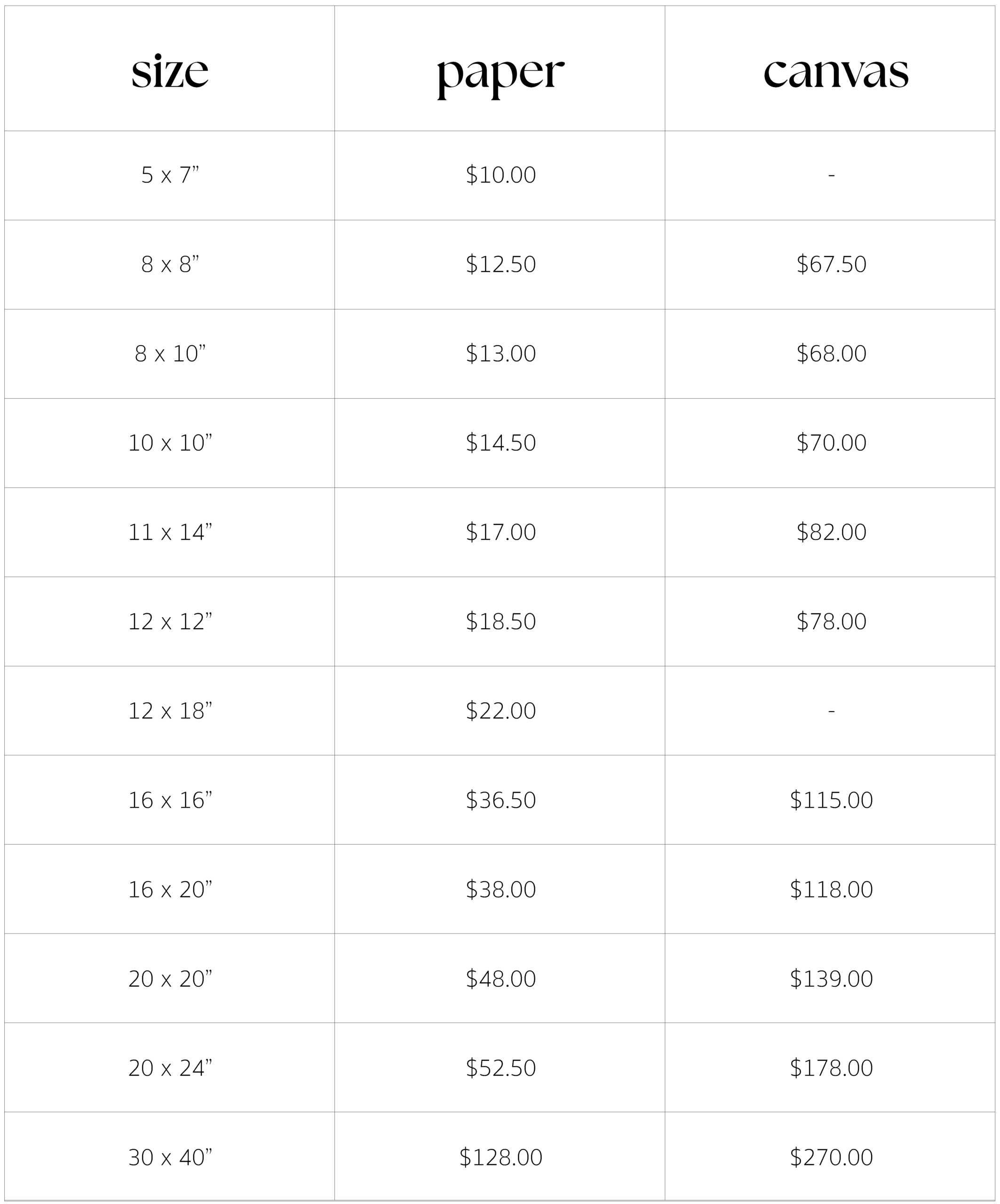 these are the most popular print sizes, but there are many more to choose from. paper prints are available in a wider range of sizes.