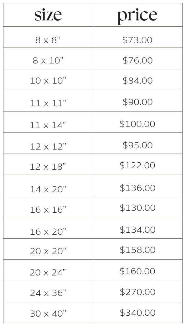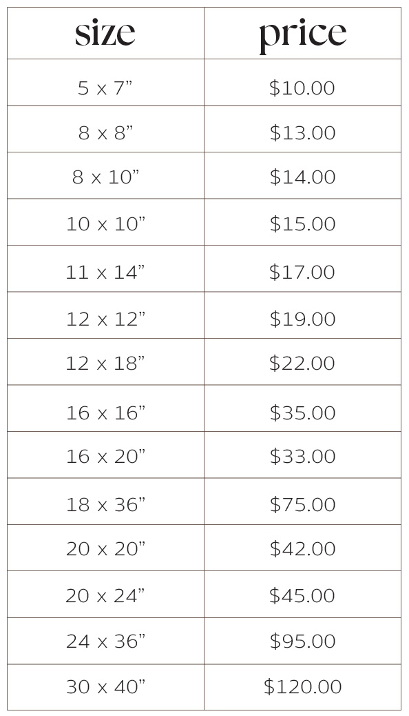 these are the most popular print sizes, but there are many more to choose from. if you have a custom size in mind, just let me know and I can get a quote for you.